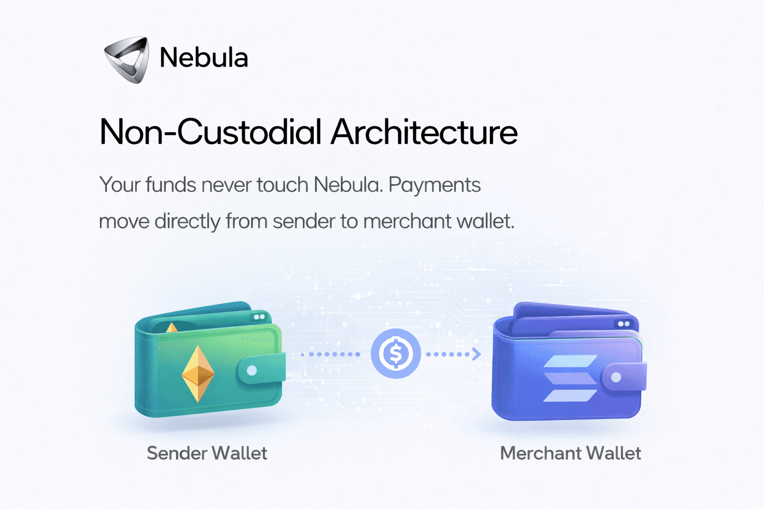 Your funds never touch Nebula. Payments move directly from sender to merchant wallet.